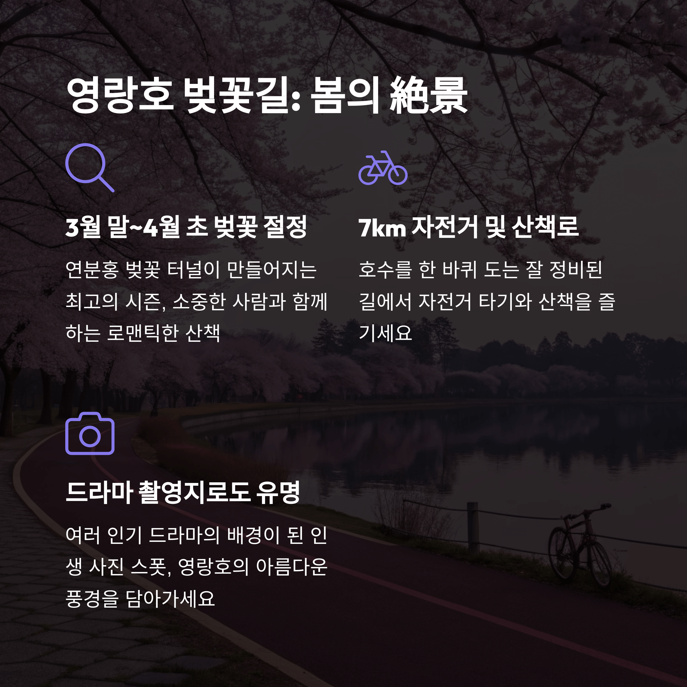 특히 영랑호 벚꽃길은 개화 시기에 맞춰 방문한다면 풍성한 벚꽃과 드넓은 호수를 함께 볼 수 있는 장소로 최고입니다.