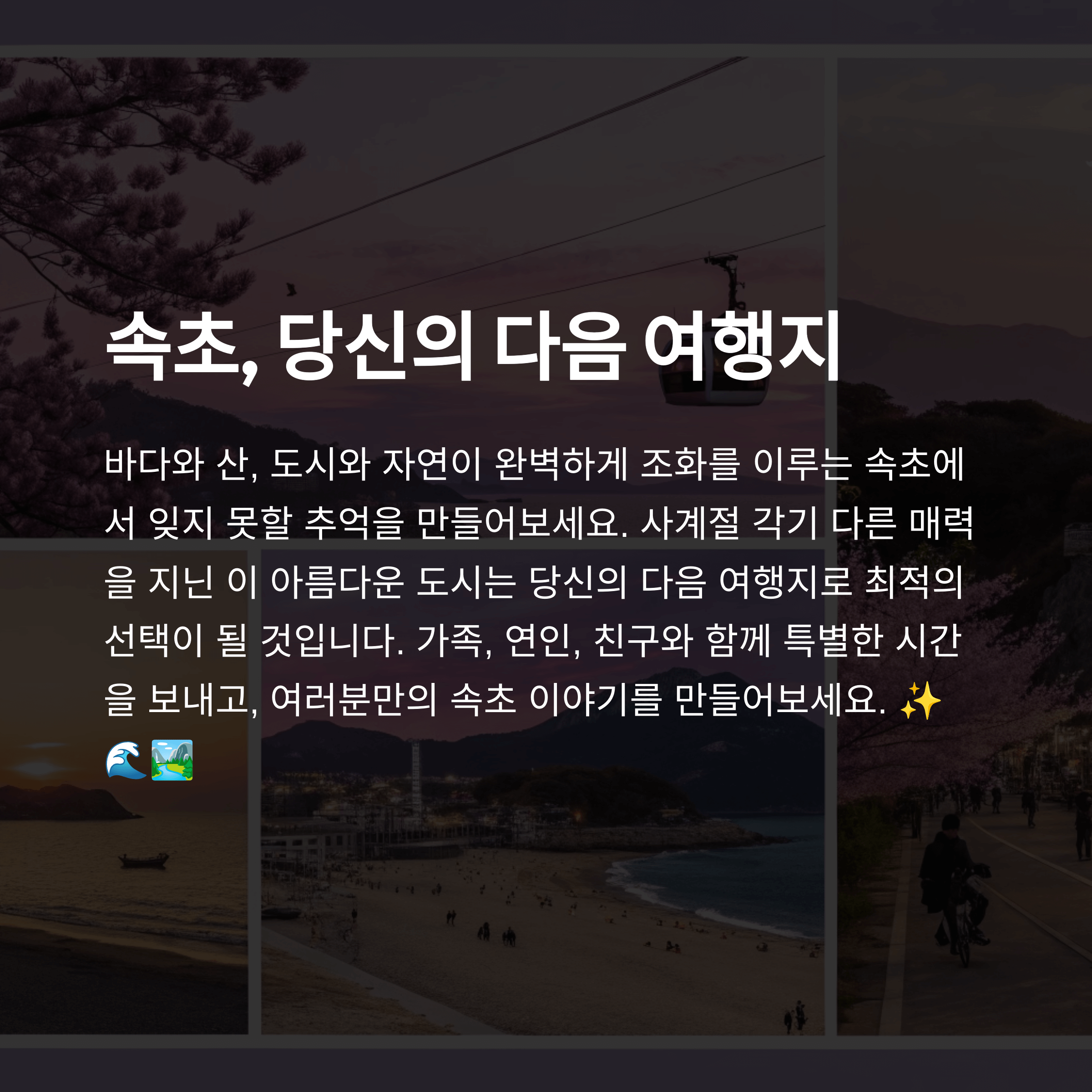 속초는 매년 많은 여행객이 찾는 바다와 자연의 아름다움으로 유명한 곳입니다.